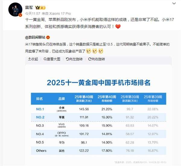 小米創始人雷軍在轉發相關博文時特別指出,消費者對17系列在創新技術、使用體驗和產品質感方面的認可,是此次奪冠的關鍵因素。數據顯示,黃金周期間國內手機市場前五品牌依次為小米、蘋果、vivo、OPPO和華為,其中小米以顯著優勢領跑。