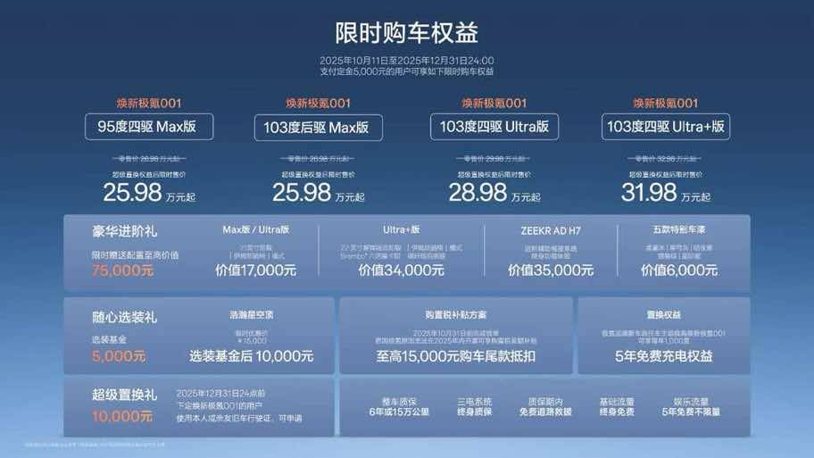 極氪品牌近日宣布,旗下新能源獵裝轎跑車型——煥新極氪001正式登陸市場,起售價定為26.98萬元。若疊加超級置換權益,消費者可享受限時25.98萬元起的優惠價格。品牌還推出了一系列限時購車福利,涵蓋豪華進階禮包、隨心選裝方案、購置稅補貼、置換支持以及質保與流量服務等,旨在為消費者提供全方位的購車體驗。