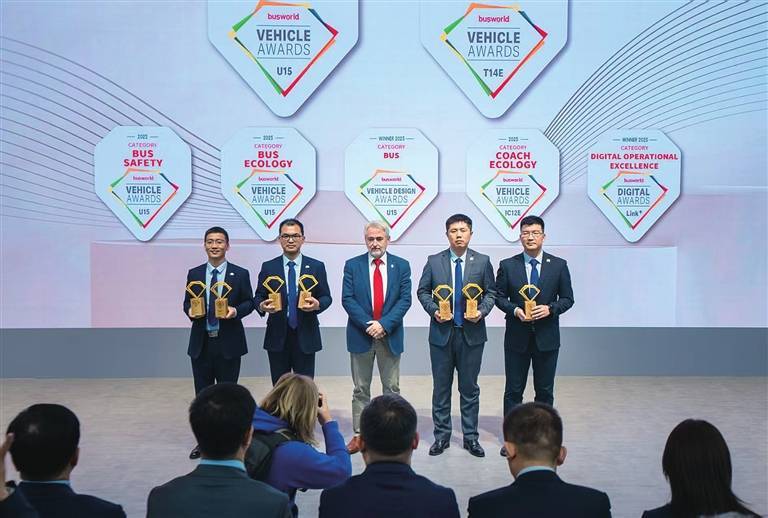 在城市公交領域,15米高端城市公交U15的表現同樣亮眼。該車型以“三電”防護等級IP68+IP6K9K和YESS電池安全防護系統為核心,搭配Link+車隊管理系統和智能化監控平臺,實現了對車輛運營、道路狀況等數據的全方位收集與預警。其“更安全、更耐用、更智能”的特性,助其一舉斬獲“年度最佳巴士大獎”“安全獎”“生態環保獎”和“設計獎”四項殊榮,成為Busworld Bus組的最大贏家。