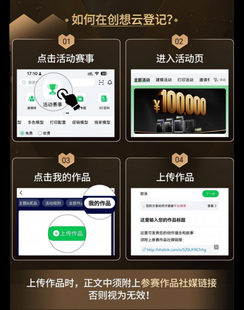 活動(dòng)規(guī)則:用戶使用K2系列機(jī)型完成創(chuàng)意打印作品,記錄創(chuàng)作過(guò)程并發(fā)布至社交平臺(tái),同步在創(chuàng)想云完成登記即可參與。