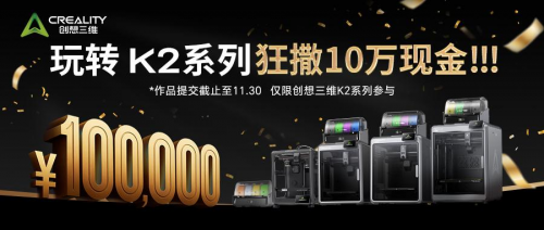 為鼓勵(lì)用戶創(chuàng)意落地,創(chuàng)想三維特別策劃“K2系列創(chuàng)作大賽”,總獎(jiǎng)金池高達(dá)10萬(wàn)元,面向所有K2系列打印機(jī)用戶開(kāi)放。