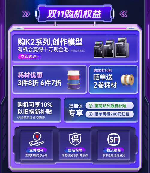 本次活動(dòng)覆蓋3D打印機(jī)、掃描儀、雕刻機(jī)及耗材全品類,不僅有爆款機(jī)型首發(fā)價(jià)格回歸、多檔折扣疊加,更推出K2系列10萬(wàn)元現(xiàn)金創(chuàng)作大賽+半價(jià)抽獎(jiǎng)雙重加碼,同步強(qiáng)化售后保障,讓用戶“買(mǎi)得值、用得爽、無(wú)顧慮”!