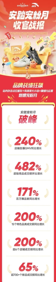 數據顯示,8月8日-9月17日活動期間,安踏寵粉月活動整體曝光突破7億,安踏品牌成交破峰。其中店鋪自播GMV同比增長240%, 超6個店鋪成交額同比增長200%,15個特色品類成交額同比增長200%。超級鏈接商品成交額環比增長482%,百萬爆品數同比增長171%,超700個新品成交額同比增長65%。
