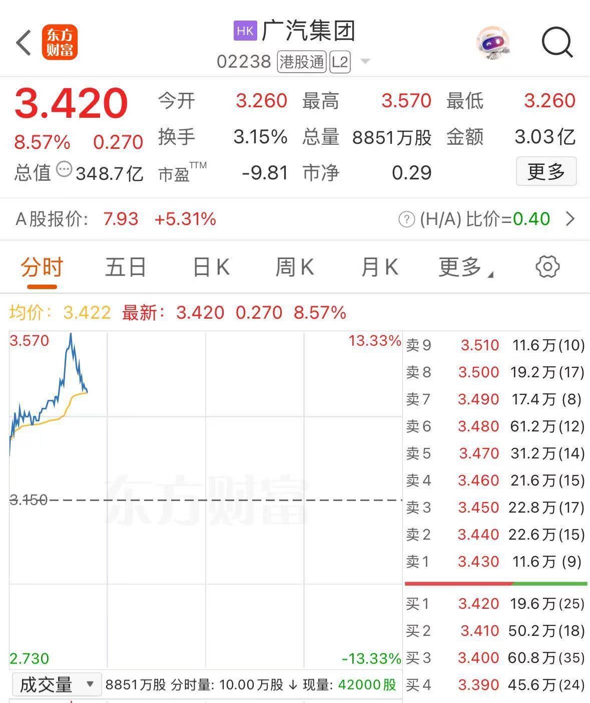 10月15日,廣汽集團在港股市場表現亮眼,股價早盤高開高走,盤中漲幅一度突破13%。截至上午10時35分,雖然股價有所回落,但仍保持8.57%的漲幅,最終報3.42港元/股。