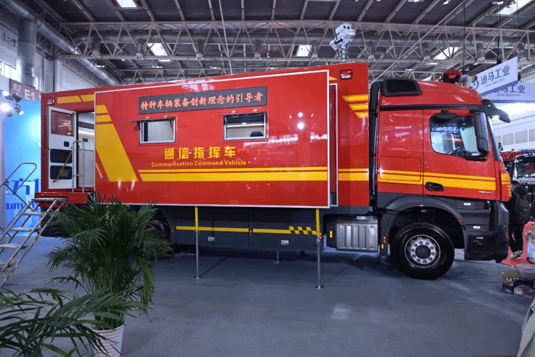 在城市主戰領域,江蘇振翔展示的奔馳Arocs1836底盤消防車實現8-10人載員能力,4-6噸載液量支持定制分隔。其消防泵與炮流量均達60-80L/s,全自動泡沫比例混合器實現1%-10%精準調控,集成控制系統覆蓋水/泡沫控制、出口恒壓、管路監控等功能,配合電動拉梯架可一鍵操作多種梯具,完美適配城市復雜救援環境。而奔馳通信指揮消防車采用雙側拓展艙結構,展開面積達20㎡,可容納20人同時作業,搭載衛星通信、無人機偵察、音視頻指揮等六大系統,配合5P恒溫與18KW發電照明裝置,構建起移動式消防指揮中樞。