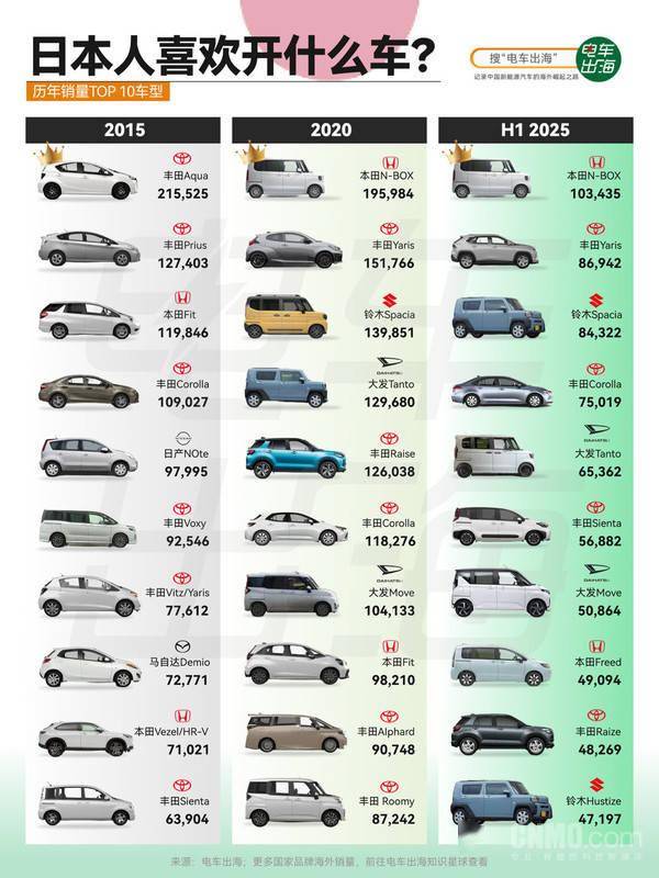 近日,一位汽車領(lǐng)域博主整理并公布了日本市場2015年、2020年及2025年上半年銷量排名前十的車型數(shù)據(jù),揭示了當(dāng)?shù)叵M(fèi)者偏好隨時(shí)間推移發(fā)生的顯著變化。