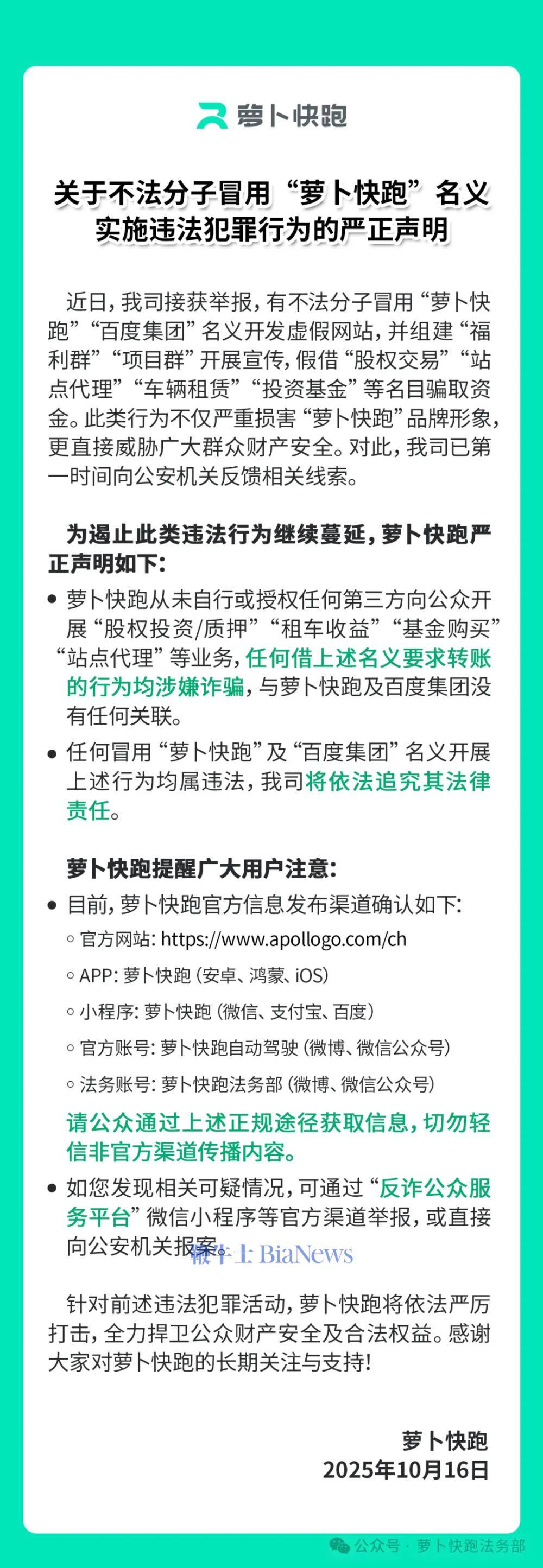 針對這一情況,“蘿卜快跑”已迅速采取行動,將相關線索移交公安機關,并配合開展調查工作。同時,品牌方提醒公眾,務必通過官方渠道獲取信息,切勿輕信非官方發布的投資或合作項目,避免陷入詐騙陷阱。