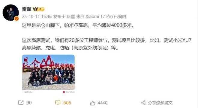 截至目前,小米公司創始人雷軍未對此次事故作出公開回應。有網友稱10月10日在喀什古城偶遇雷軍,而其社交賬號動態顯示,10月11日至12日期間,雷軍多次發布小米工程師在帕米爾高原測試新車型YU7的內容,涉及高原續航、充電性能等項目。