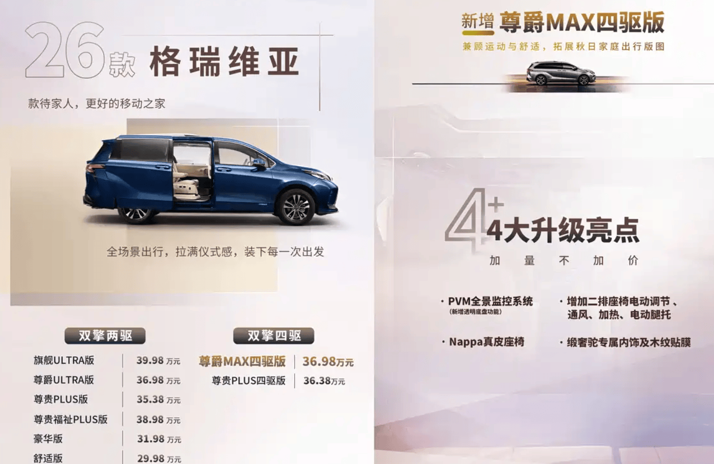 此次改款的核心亮點在于配置的全面升級。新車將配備PVM全景監控系統,提升駕駛安全性;座椅方面,二排座椅新增電動調節功能,并支持通風、加熱及電動腿托,搭配Nappa真皮材質與緞奢駝專屬內飾,營造出更高級的乘坐體驗。木紋貼膜的加入進一步提升了內飾質感。標配配置同樣豐富,包括前排電動天窗、雙側電動側滑門、電動調節外后視鏡、第二排/第三排隱私玻璃、第二排遮光簾等實用功能,同時支持HUAWEI HiCar、CarPlay及CarLife手機互聯,滿足多元化智能需求。