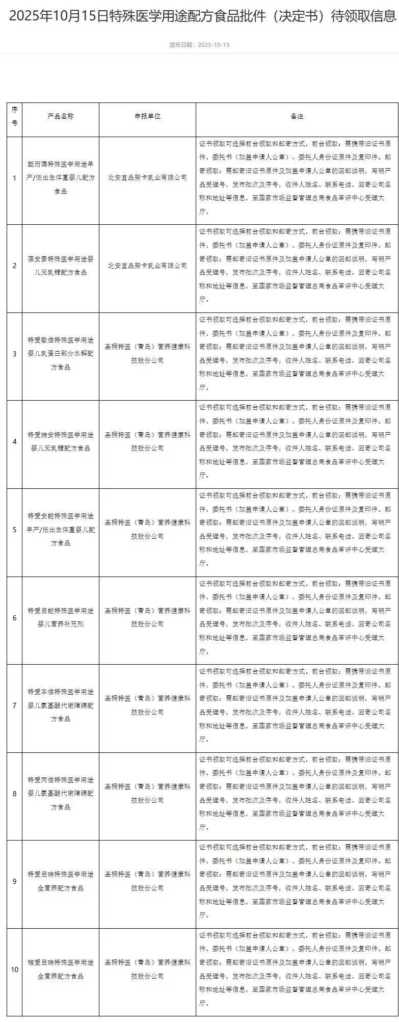 國家市場監督管理總局食品審評中心于近日公布了新一批特殊醫學用途配方食品的批件待領取信息,此次共有10款產品通過審批,分別來自宜品與圣桐特醫兩家企業。這一消息為特殊醫學用途配方食品市場注入了新的活力。