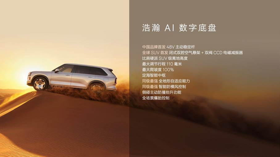 底盤技術方面,極氪9X首發搭載浩瀚AI數字底盤,集成閉式雙腔空氣懸架、雙閥CCD電磁減振器及48伏主動穩定桿技術,實現0.2秒內80毫米舉升,動態側傾接近“零側傾”。該系統首次將AI算力引入底盤域,通過定海智能中樞實現姿態控制從“事后跟隨”到“提前預判”的進化,即使在120公里/小時高速濕滑路面雙輪爆胎,仍能穩穩剎停。越野場景下,系統可自動識別深雪、泥地等7種地形并匹配專屬駕駛模式。