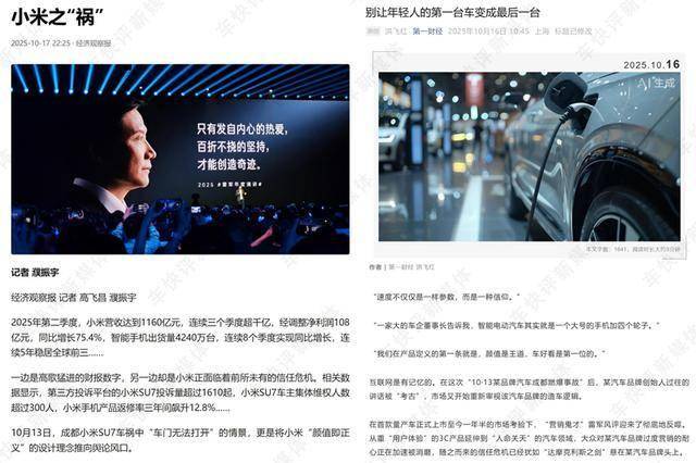這番充滿正能量的表態(tài),與小米汽車當(dāng)前面臨的安全質(zhì)疑形成了鮮明對比。10月16日,第一財經(jīng)發(fā)表題為《別讓年輕人的第一臺車變成最后一臺》的評論文章,直指小米汽車在安全性能方面存在的問題。該文發(fā)布后迅速引發(fā)網(wǎng)絡(luò)熱議,截至10月19日晚,文章訪問量已突破10萬次,轉(zhuǎn)發(fā)量超過1萬次。
