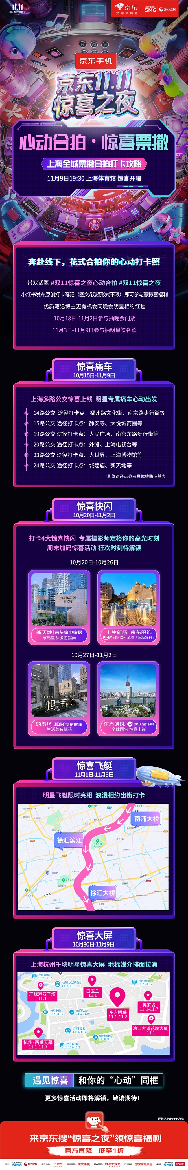 除線上互動(dòng)外,京東還打造了一系列線下打卡活動(dòng),邀請用戶在上海解鎖驚喜體驗(yàn):10 月15日至11月9日,上海14 路、15路等多路 “明星專屬痛車” 將穿行在上海福州路文化街、外灘、大世界、城隍廟等熱門地標(biāo),用戶打卡拍照即可參與互動(dòng);10月20日至11月2日,上海新天地、上生新所、鴻壽坊、東方明珠廣場將陸續(xù)開啟 “驚喜快閃” 活動(dòng),不僅有專屬攝影師為參與者記錄高光時(shí)刻,還會(huì)有明星空降快閃現(xiàn)場;11月 1 日至11月3日,“明星飛艇” 將限時(shí)亮相上海上空,開啟浪漫巡游;10月30日至 11 月9日,上海與杭州將實(shí)現(xiàn)千塊明星驚喜大屏跨城聯(lián)動(dòng),傳遞 “心動(dòng)信號”。