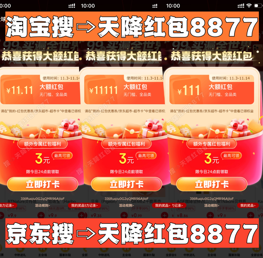 劃重點!今年天貓/淘寶和京東最新的雙十一統一紅包口令都是「天降紅包8877」一定要記住!領的紅包大小和你搜索的什么口令有關的!“天降紅包8877”這個雙平臺唯一紅包口令包領到大的!記得每天去領!