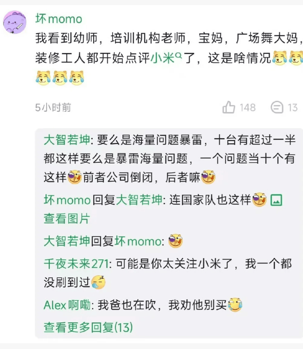 批評(píng)者指出,作為依靠流量崛起的科技企業(yè),小米如今遭遇流量反噬實(shí)屬必然。有觀察者發(fā)現(xiàn),連參與討論的網(wǎng)友都在這場(chǎng)輿論盛宴中分得一杯羹。更有尖銳聲音直指產(chǎn)品缺陷,認(rèn)為門(mén)把手等設(shè)計(jì)問(wèn)題若持續(xù)存在,可能觸發(fā)大規(guī)模召回。這些聲音交織成一張密集的質(zhì)疑網(wǎng),將小米汽車(chē)推上風(fēng)口浪尖。