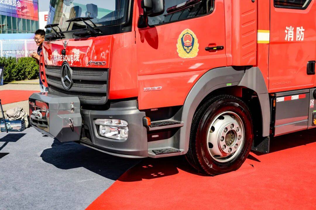本屆消防展上,由威海廣泰改裝的梅賽德斯-奔馳Atego 1330壓縮空氣泡沫消防車成為焦點。相較于去年廬山首秀的Atego 1530車型,該車驅(qū)動形式由4x4調(diào)整為4x2,離地間隙降低200mm,更適配城市復(fù)雜路況。其單排駕駛室+獨立乘員艙設(shè)計可容納8名消防員同時出動,與歐洲主流主戰(zhàn)消防車配置保持同步。車輛采用最短日間駕駛室結(jié)構(gòu),為上裝設(shè)備預(yù)留充足改裝空間,同時提供加長型日間駕駛室、平頂帶臥鋪及高頂帶臥鋪駕駛室等多樣化選擇。