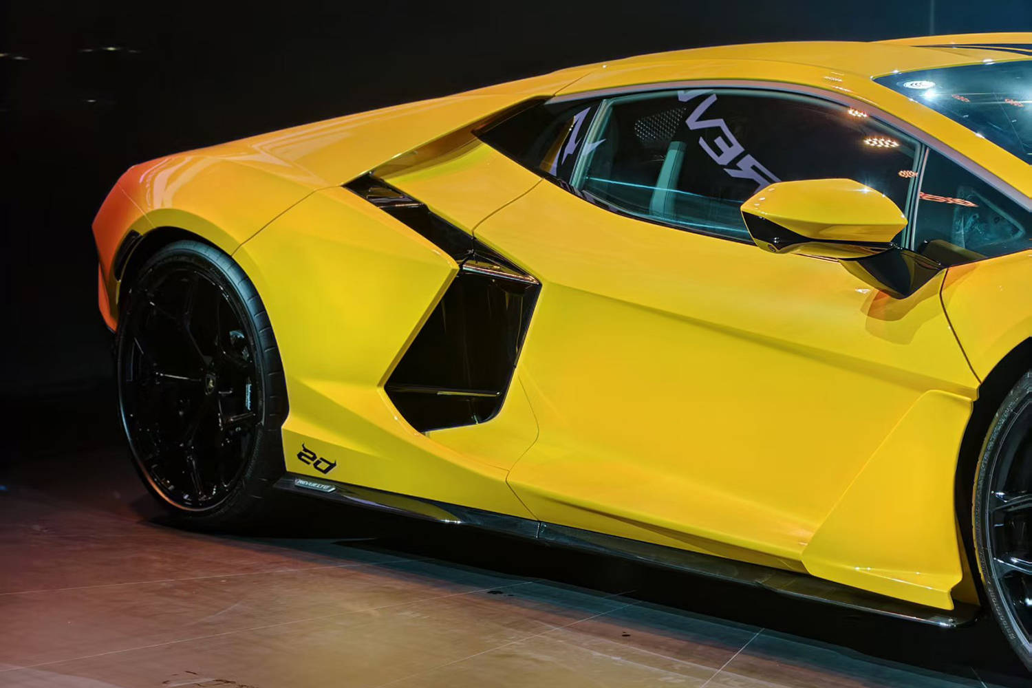 車身側(cè)面延續(xù)了剪刀門這一經(jīng)典設(shè)計元素,后翼子板懸浮鋒片的造型則傳承自Diablo車型的經(jīng)典設(shè)計語言。側(cè)裙位置特別標(biāo)注的"20"字樣,與前20寸、后21寸的碳纖維輪圈形成呼應(yīng)。制動系統(tǒng)采用前10活塞/后4活塞卡鉗搭配410毫米碳陶剎車盤,在輕量化與制動效能之間取得完美平衡。