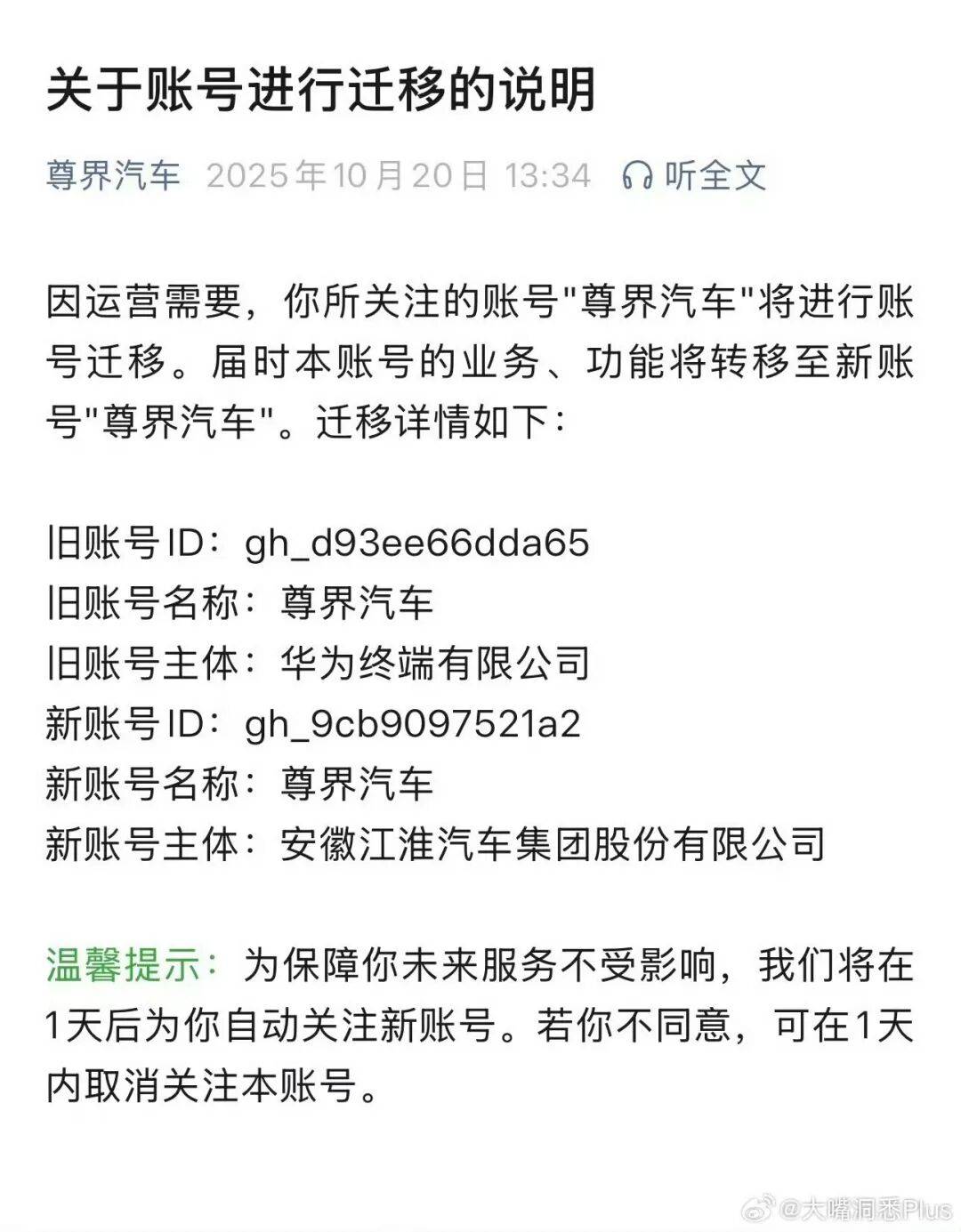 近日,尊界汽車公眾號發布了一則賬號遷移通知,引發行業關注。根據公告內容,原“尊界汽車”公眾號因運營調整,將業務與功能整體遷移至新賬號,賬號主體由華為終端有限公司變更為安徽江淮汽車集團股份有限公司。這一變動標志著雙方在品牌運營層面的合作模式進一步深化。
