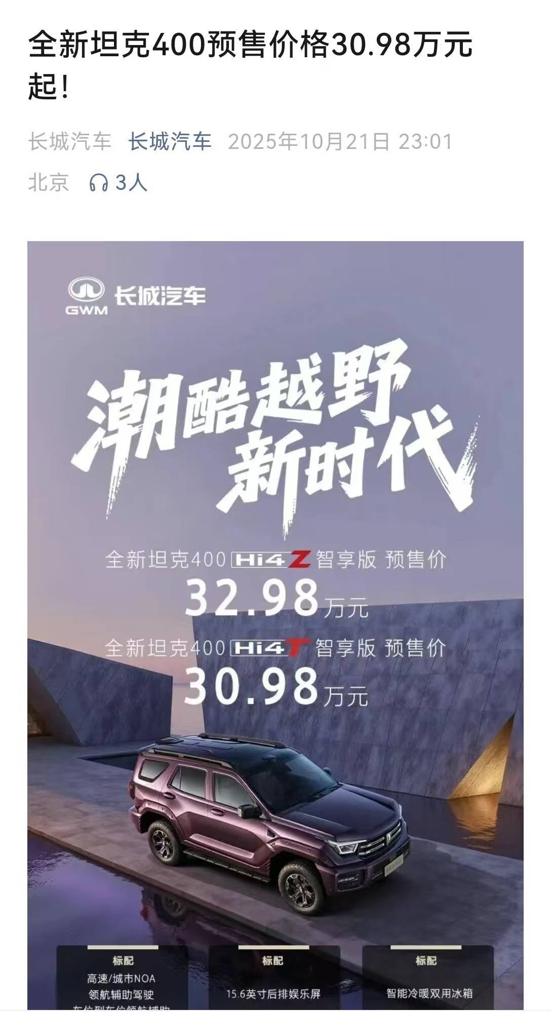 長(zhǎng)城汽車近日動(dòng)作頻頻,不僅在市場(chǎng)銷量上屢創(chuàng)佳績(jī),更在產(chǎn)品布局與全球化戰(zhàn)略方面邁出堅(jiān)實(shí)步伐。10月21日晚間,長(zhǎng)城汽車官方發(fā)布消息,旗下新款坦克400正式開(kāi)啟預(yù)售,起售價(jià)定為30.98萬(wàn)元,這一價(jià)格區(qū)間無(wú)疑為中高端SUV市場(chǎng)注入了新的活力。