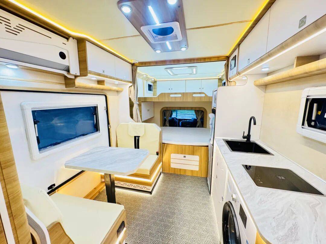 廚房區配備洗菜池、1000W電磁爐、微波爐及150L冰箱,滿足基礎烹飪需求,臺面下8KG洗衣機解決旅途換洗難題。休息區采用雙層床設計,下鋪雙人床與上鋪額頭床均配備透光窗與獨立閱讀燈,兼顧采光與夜間照明,營造溫馨休憩環境。