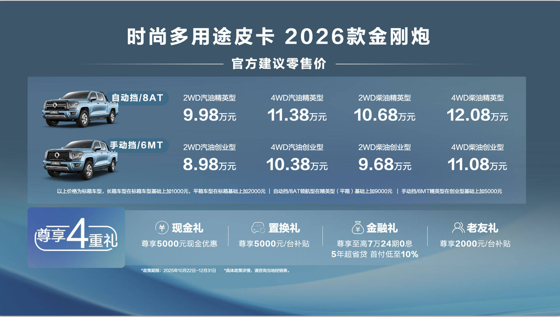 在當前皮卡市場“內卷”加劇的環境下,2026款金剛炮通過價格調整與配置升級,強化了性價比優勢。盡管動力系統未作改動,但部分車型售價下調,乘用化配置下放,貨箱功能增強,使其在商用皮卡領域保持競爭力。