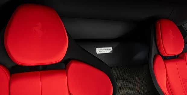內飾設計延續了經典與現代相結合的理念。腳踏區域、座椅靠背、儀表臺和方向盤裝飾件均采用碳-凱夫拉復合材料,這種曾在F40上用于實現極致輕量化的材質,如今以更先進的工藝重現。座椅采用紅色提花織物與黑色Alcantara材質拼接,還原了F40簡約絨面儀表板的運動風格,在細節處呼應了復古主題。從碳纖維材質到織物選擇,每一處設計都體現了對經典與現代的平衡。