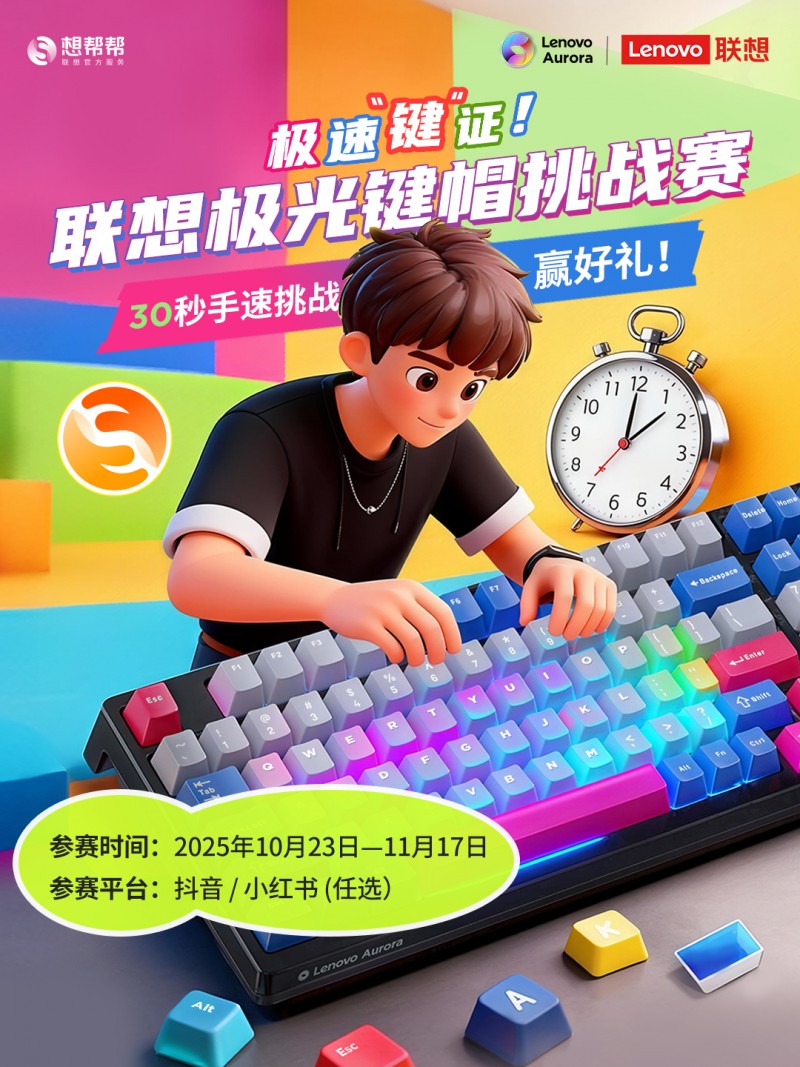 想試試手速能不能上熱榜?或者單純想為自己的鍵盤找點存在感?別猶豫了,現在就能參與挑戰,不止收獲點贊,更可能收獲一套真正會“發光”的桌搭好物。更多活動詳情及參與方式,請關注小紅書/抖音【聯想服務】官方賬號10月23日發布的挑戰賽內容