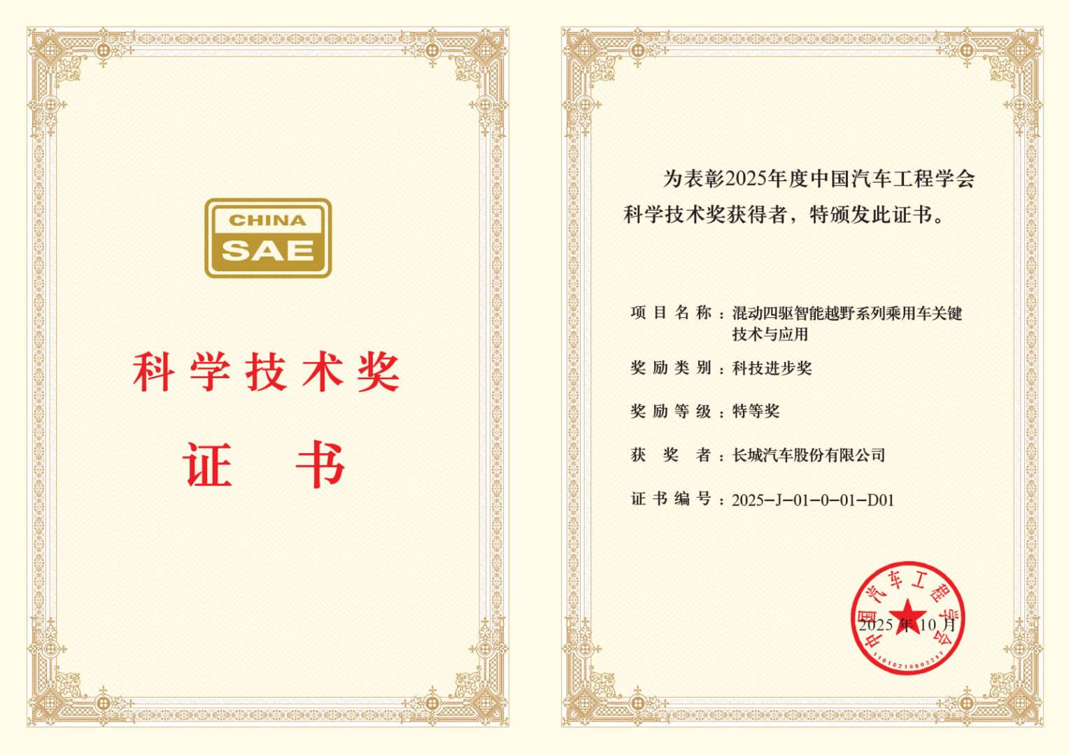近日,長城汽車憑借《混動四驅智能越野系列乘用車關鍵技術與應用》項目,斬獲中國汽車工程學會科學技術獎特等獎。這一獎項的授予,標志著長城汽車在混動技術領域的創新成果獲得權威認可,也是該獎項設立30余年來首次將特等獎授予混動技術。