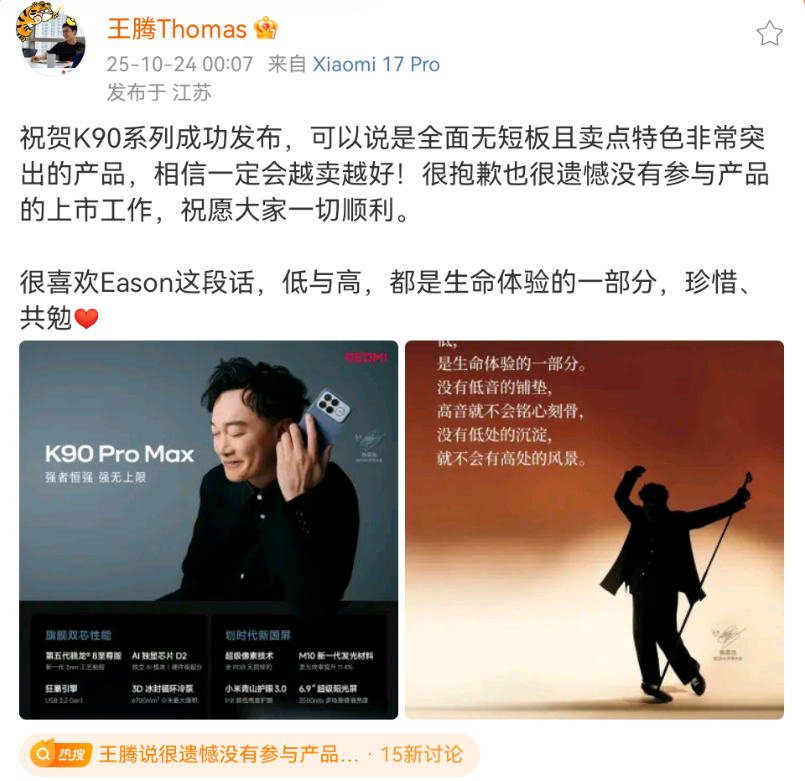 自10月17日紅米手機(jī)官宣發(fā)布會(huì)時(shí)間起,王騰便通過(guò)微博表達(dá)對(duì)產(chǎn)品的關(guān)注。他轉(zhuǎn)發(fā)官方信息并透露,K90 Pro Max的研發(fā)團(tuán)隊(duì)傾注了大量心血,預(yù)祝新品發(fā)布順利。23日發(fā)布會(huì)當(dāng)天凌晨,他再次發(fā)文稱贊該系列為"全面無(wú)短板且賣點(diǎn)突出"的產(chǎn)品,雖遺憾未能參與上市工作,仍送上誠(chéng)摯祝福。這一系列舉動(dòng)迅速引發(fā)網(wǎng)友熱議,相關(guān)話題登上微博熱搜榜。