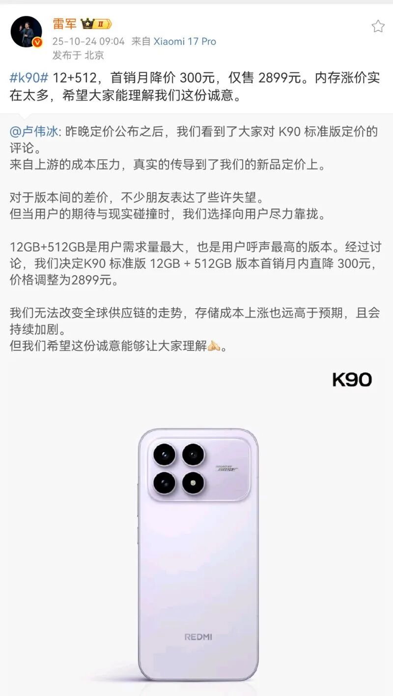 面對(duì)市場(chǎng)對(duì)定價(jià)的質(zhì)疑,小米管理層迅速作出回應(yīng)。盧偉冰公開(kāi)解釋稱,受全球供應(yīng)鏈成本上漲影響,存儲(chǔ)器件價(jià)格漲幅遠(yuǎn)超預(yù)期且持續(xù)加劇。為回饋消費(fèi)者,公司決定將K90標(biāo)準(zhǔn)版12GB+512GB版本在首銷月內(nèi)直降300元,調(diào)整后售價(jià)2899元。他強(qiáng)調(diào)這一決策體現(xiàn)了企業(yè)的誠(chéng)意,希望用戶理解行業(yè)現(xiàn)狀。小米創(chuàng)始人雷軍隨后轉(zhuǎn)發(fā)該聲明,進(jìn)一步說(shuō)明內(nèi)存漲價(jià)的實(shí)際情況。