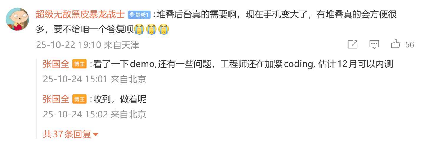 事件起因于10月22日,某用戶在張國全轉發的技術訪談微博下留言,指出當前大屏手機缺乏高效的后臺管理方案。該用戶特別提到,若能實現按應用啟動時間排序的堆疊式后臺界面,將顯著提升多任務處理效率。這種設計允許用戶通過橫向滑動查看后臺應用,每個程序卡片會以動態效果依次展開,既保證信息完整性又提升操作直觀性。