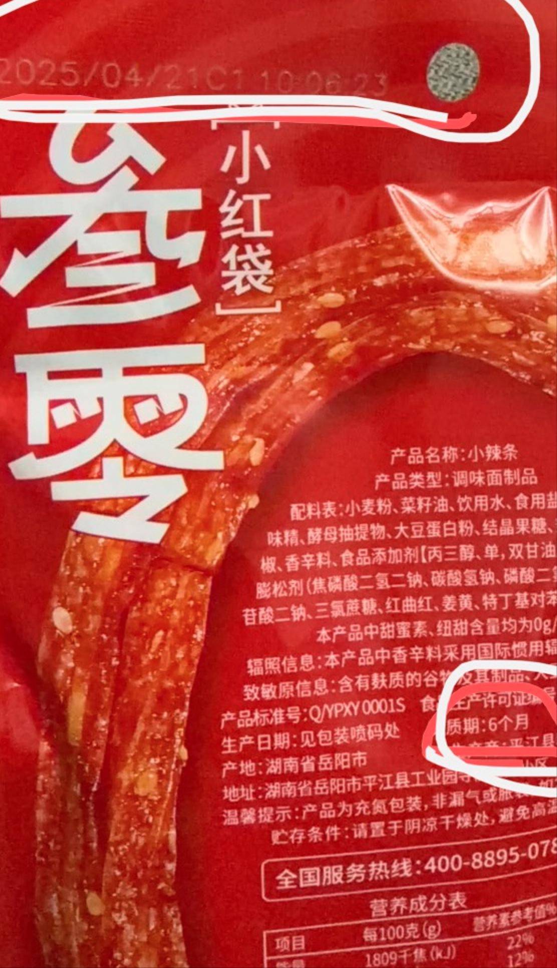 據(jù)消費(fèi)者描述,2025年10月21日,他在拼多多某店鋪下單了一款名為“君仔精選捕味叁零辣條”的商品。商品標(biāo)注的生產(chǎn)日期為2025年4月21日,保質(zhì)期6個月,按此計算,10月21日當(dāng)天正是保質(zhì)期的最后一天。然而,當(dāng)消費(fèi)者于10月23日收到貨物時,發(fā)現(xiàn)辣條已過期兩天。