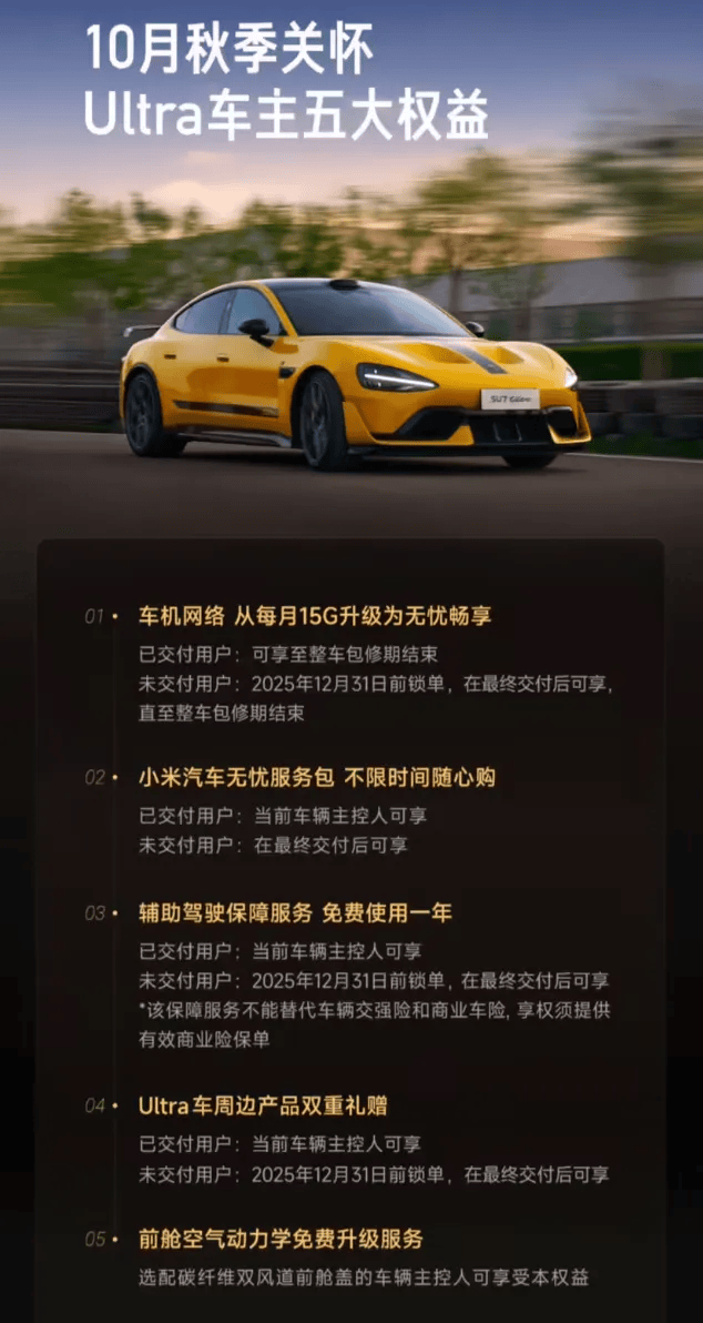 近日,小米汽車針對SU7 Ultra車型推出“10月秋季關懷”專項權益計劃,為已交付及未交付用戶提供涵蓋網絡服務、無憂保障、輔助駕駛、周邊禮品及空氣動力學升級在內的五大權益,覆蓋車輛全生命周期。