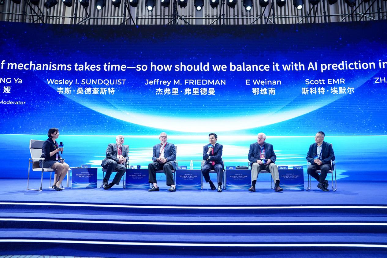 在主旨圓桌論壇中,鄂維南院士、杰弗里·弗里德曼(Jeffery Friedman)教授、韋斯·桑德奎斯特(Wesley I.Sundquist)教授、斯科特·埃默爾(Scott D.Emr)教授、張康教授圍繞AI如何真正推進未來藥物研發這一核心議題展開深度對話。五位頂尖科學家從科學數據的可信性、機制理解與AI預測的關系、如何規模化擴展等維度分享觀點,對未來藥物與治療研發的核心挑戰提出具有前瞻性的思考。圓桌論壇由上海交通大學人工智能學院副院長、醫學人工智能研究院常務副院長張婭教授主持,現場思想激蕩,金句頻出,堪稱一場高水平的學術思辨盛宴。