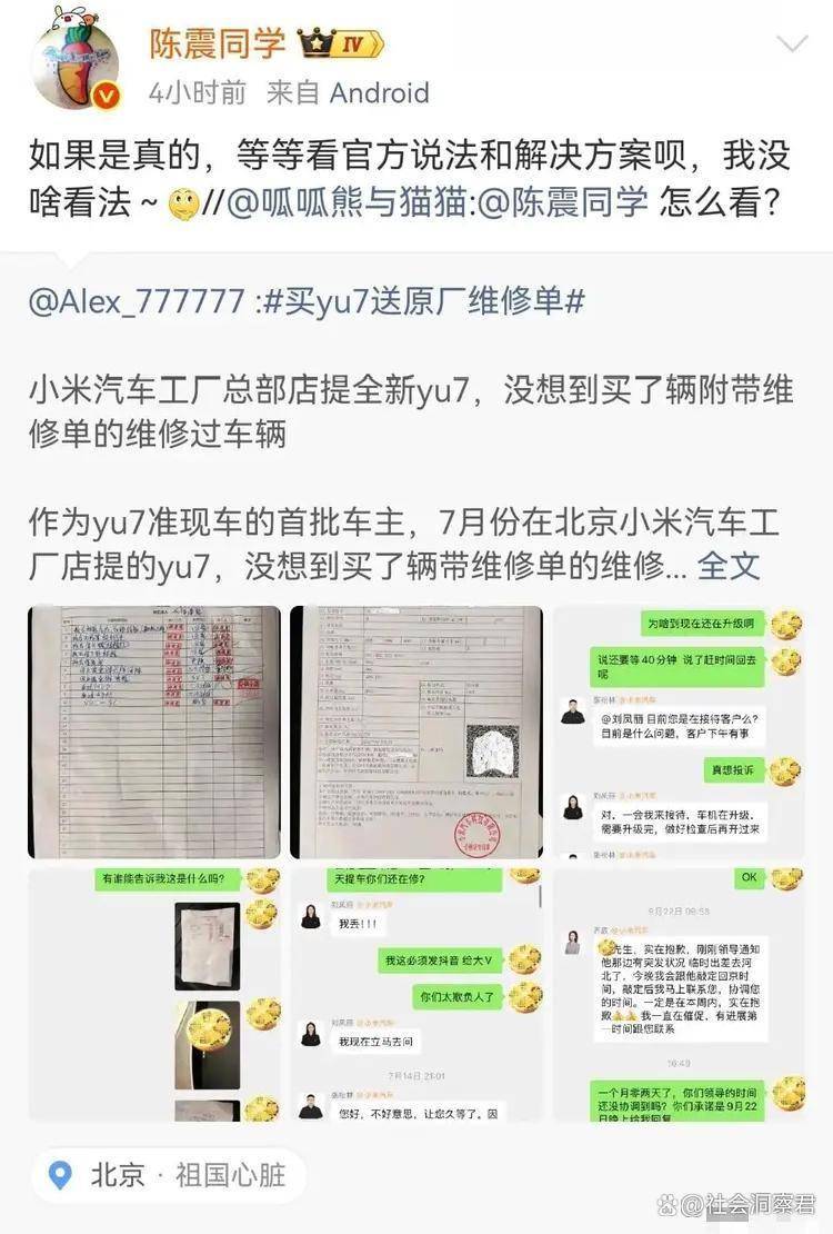 全新YU7前備箱現小米工廠工單引熱議,陳震回應暫觀官方說法,車主維權路何去何從