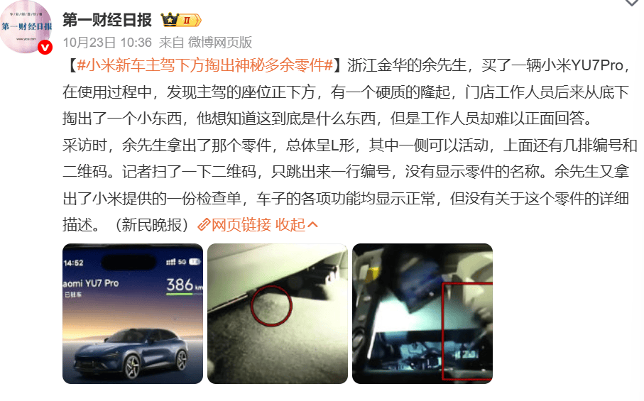 浙江義烏,一位新購小米YU7 Pro的車主在提車后發現車內存在異常部件,引發市場監管部門介入調查。據車主余先生反映,10月12日他花費30余萬元購置了這輛新能源汽車,僅兩天后便在更換腳墊時察覺主駕駛座椅下方有硬質凸起物。