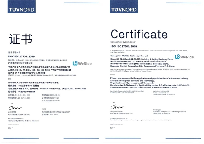 未來,隨著自動駕駛技術的不斷迭代和業務場景的持續拓展,隱私保護的重要性將愈發凸顯。文遠知行將以此次認證為新起點,持續完善信息安全與隱私保護體系,不斷強化數據治理能力,為行業隱私保護標準的提升和智能出行生態的健康發展貢獻力量。