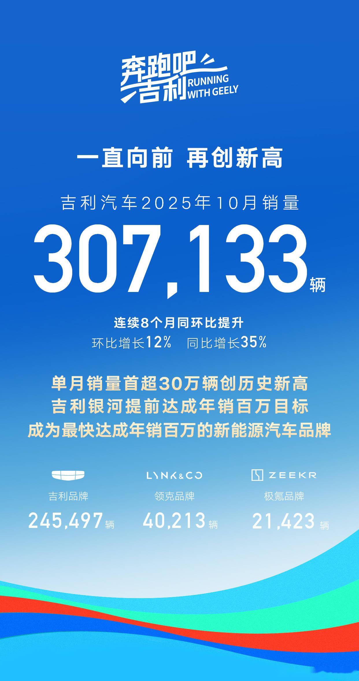 近日,國內汽車市場傳來一則振奮人心的消息:吉利汽車在10月份交出了一份亮眼的成績單,單月銷量突破30萬輛大關,達到307133輛,刷新了企業單月銷量紀錄。更令人矚目的是,這已是吉利汽車連續第8個月實現銷量同比與環比雙增長,其中環比增長12%,同比增長35%,展現出強勁的市場競爭力。