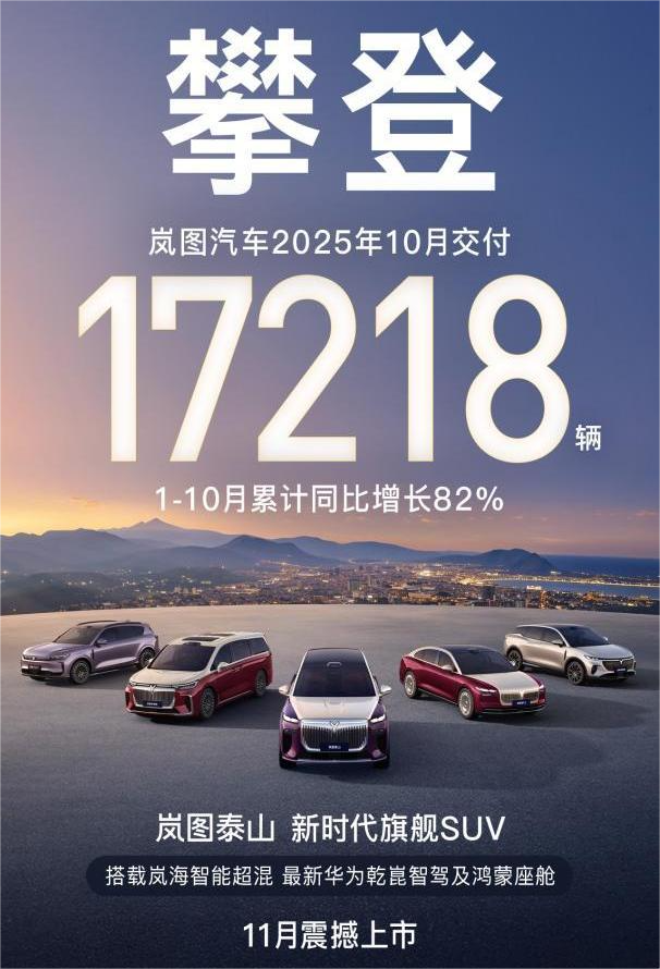 在中國新能源汽車市場的激烈競爭中,交付量的持續攀升已成為衡量品牌競爭力的重要指標。近日,嵐圖汽車憑借單月17218輛的交付成績,實現連續九個月正增長,1-10月累計銷量同比增長82%,這一數據不僅刷新了自身紀錄,更標志著這家央國企背景的高端新能源品牌正式邁入規模化與品牌力協同發展的新階段。