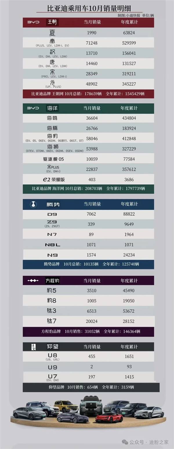 比亞迪在2025年10月交出了一份亮眼的銷售成績單,單月銷量達441706輛,刷新年內紀錄。旗下多個品牌及車型均展現出強勁的市場表現,其中9款車型月銷量突破2萬輛,方程豹鈦7更是以20024輛的成績首次躋身“2萬俱樂部”。