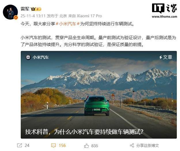 雷軍近日就小米汽車的測試體系,尤其是“三高”(高溫、高寒、高原)測試環節,向外界進行了詳細介紹。汽車測試被視為一個貫穿車輛全生命周期的動態優化過程,涵蓋設計、開發、生產到使用的各個階段,主要分為量產前驗證測試和量產后泛化測試兩大階段。