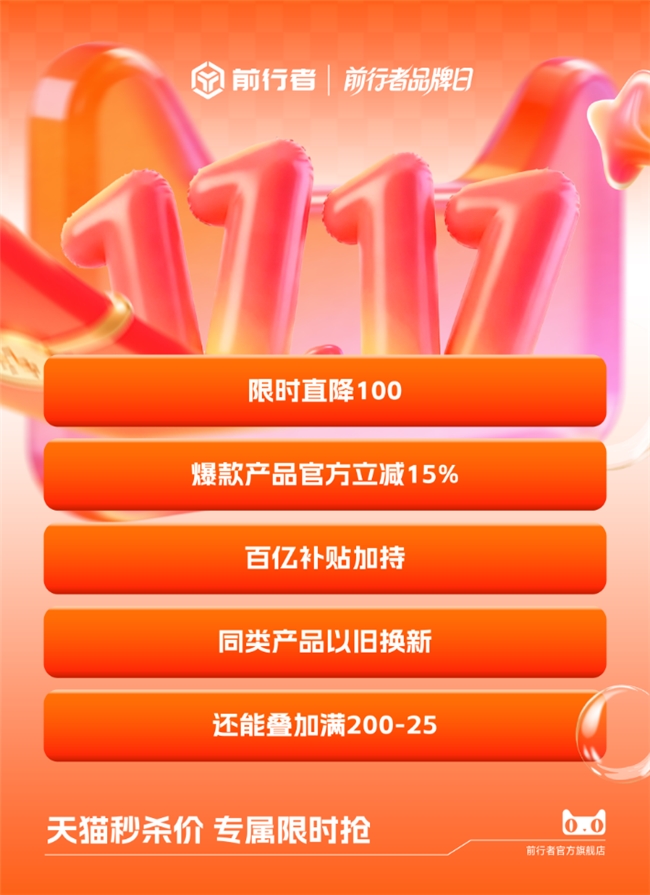天貓平臺:前行者主打“秒殺價”和“限時立減”。爆款產品官方立減15%,百億補貼加持,享受同類產品以舊換新同時支持“每滿200減25”的跨店滿減。