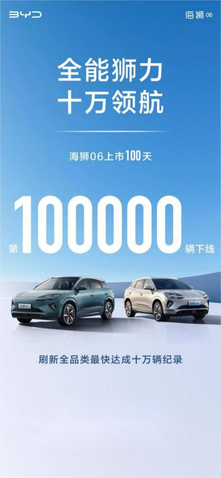 比亞迪海洋網旗下“高能超享SUV”海獅06迎來重要里程碑——上市僅百日,第十萬輛整車正式下線。這一成績不僅刷新了全品類車型突破十萬輛的最快紀錄,更以“海獅06速度”彰顯其市場號召力,為主流SUV市場樹立了新的價值標桿。