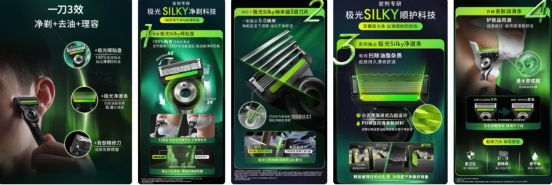 吉列極光刀精準地解決了手動剃須的幾大傳統痛點,例如貼合不足導致剃不凈、刀片鋒利度與舒適度難兼顧和皮膚敏感易受刺激等等。最終呈現給用戶的,是一種高效、徹底、舒適且富有格調的剃須體驗。