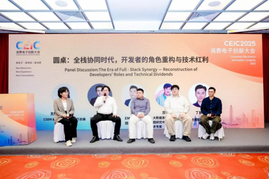 在圓桌環節,由CSDN &《新程序員》執行總編唐小引主持的圓桌高峰對話。劉洋、王凡、蘇宇榮、丁張弛四位嘉賓圍繞“全棧協同時代,開發者的生態紅利與角色躍遷”的核心主題,從技術趨勢、產業實踐到個人成長展開多維度深度思辨,為開發者精準錨定機遇、實現角色升級提供了實操性指引。