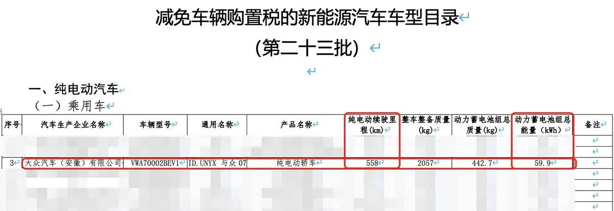 工信部最新公布的《第二十三批減免車輛購置稅的新能源汽車車型目錄》中,大眾安徽旗下全新車型“與眾07”的續航申報信息引發關注。這款基于全新電子電氣架構打造的純電動SUV,計劃于2026年正式上市,其CLTC工況下續航里程達558公里,配備59.9kWh容量電池組,展現出大眾在新能源領域的技術積淀。