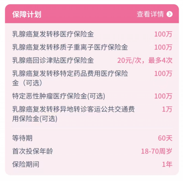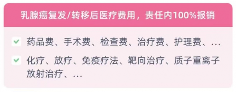 首次確診復發或轉移后,1年內特定藥品費用最高報銷100萬元,覆蓋藥品費、手術費、檢查費、治療費、護理費、化療、放療、免疫療法、靶向治療、質子重離子放射治等醫療支出,責任范圍內100%賠付。