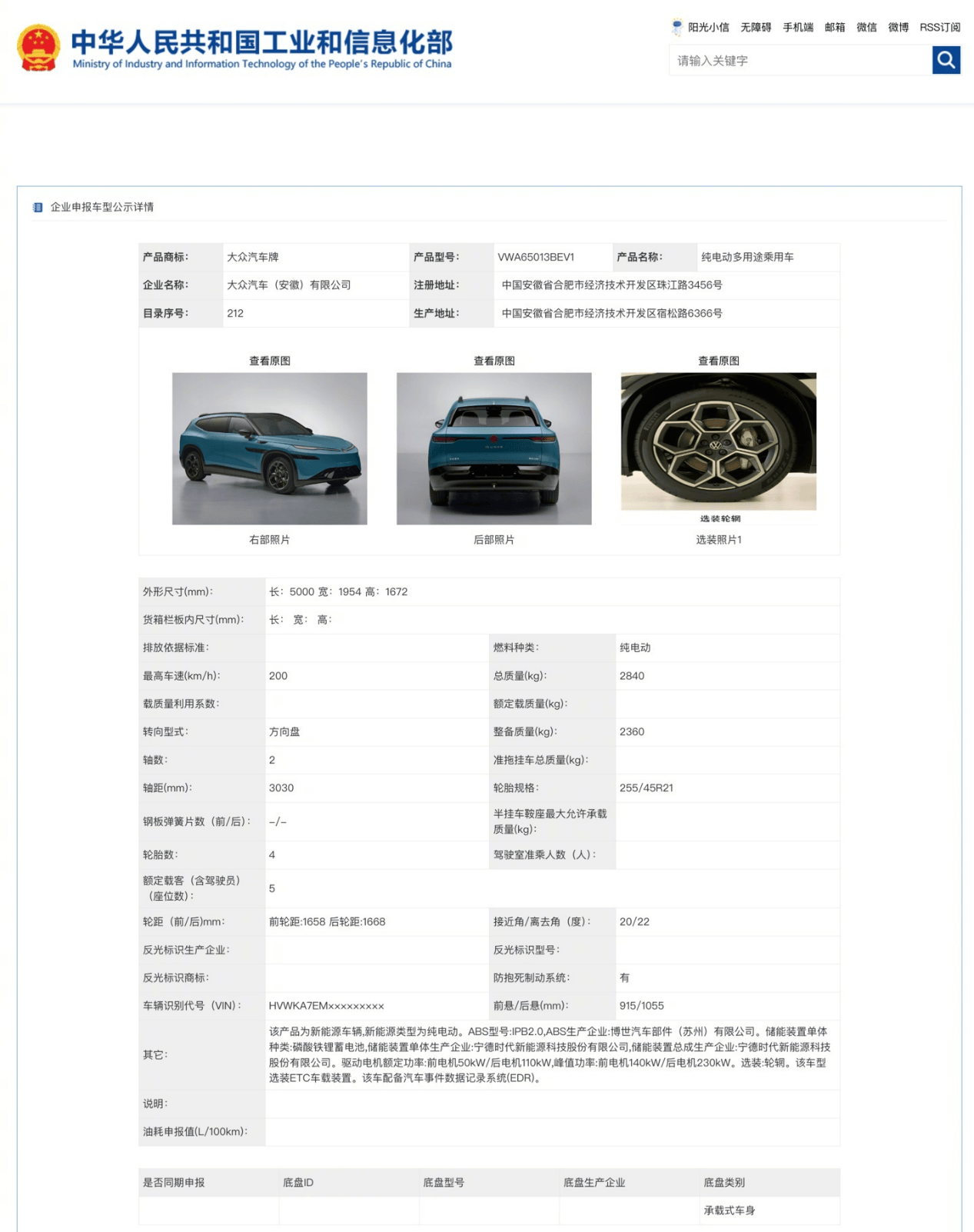 在工信部最新公布的第401批新車申報目錄中,大眾安徽旗下全新車型——與眾08正式完成申報。這款定位中大型SUV的新車,車身尺寸達到5000mm×1954mm×1672(1688)mm,軸距3030mm,直接對標小米YU7、問界M7、理想L6等市場熱門車型,展現出大眾品牌在新能源領域的強勁布局。
