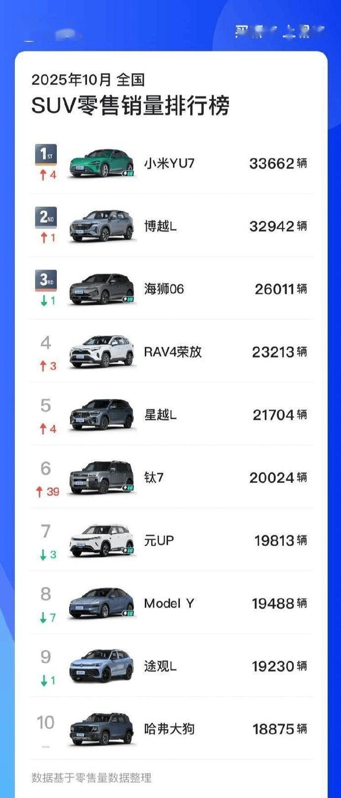 近日,汽車市場傳來一則令人矚目的消息:在易車發(fā)布的“2025年10月全國SUV零售銷量排行榜”中,小米YU7以33662輛的銷量成績力壓群雄,一舉奪得SUV零售銷量榜首,博越L、海獅06等車型則位列其后。