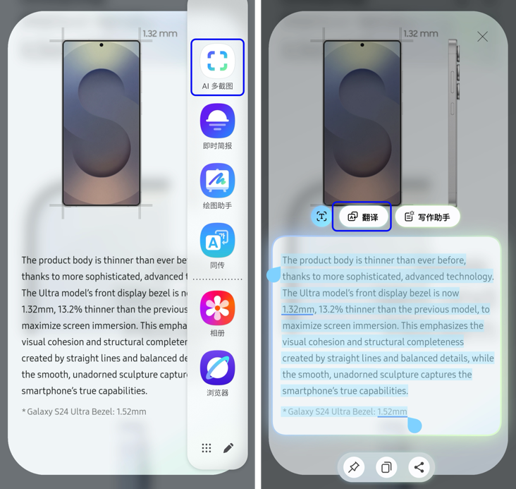 全新的“AI多截圖”功能可根據用戶行為預判操作意圖。比如在瀏覽外文資料時,用戶只需通過AI多截圖圈選文字區域,Galaxy AI便可智能識別內容,快速提供翻譯、摘要等選項,提升信息處理效率。而在觀看短視頻時,AI多截圖還支持直接圈選視頻片段,生成GIF動圖,方便用戶即時保存或分享到社交平臺,讓靈感創作更隨心所欲。
